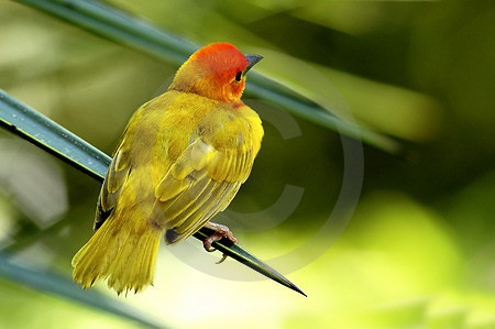 Männlicher Palmenweber (Ploceus bojeri) auf einem Palmenblatt, Kenia.