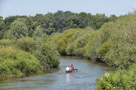 Kanuten in einem grünen Boot auf der Hase bei Haselünne-Lahre, Hasetal, Emsland